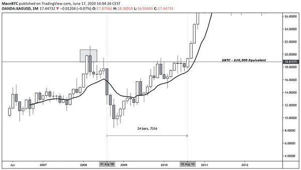除了丹·泰皮罗看好黄金和比特币之外,另一位分析师也表达了对比特币的积极态度,他就是知名加密货币交易员@Macnbtc。Macnbtc认为目前比特币价值是受到抑制的,就像2008年时的白银,当时其价格已经被抑制了数年,之后终于迎来爆发,而且涨势一直延续到了2012年(如下图所示)。