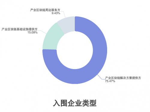 从企业类型分布来看,产业区块链解决方案提供方数量领跑,占比75.47%;产业区块链基础设施提供方占比第二,为15.09%;产业区块链周边服务方位居第三,占比9.43%。