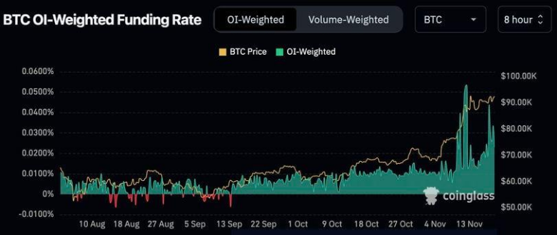 比特币永续合约资金费率飙升,为 Ethena 增长提供助力。(来源:CoinGlass)