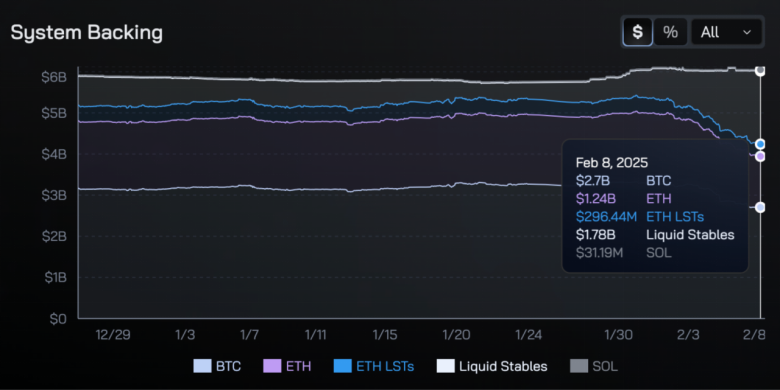 Ethena动态的资产配置方法体现在以下2月初与今天的担保资产对比中。USDe现在由近18亿美元的流动性稳定币担保,占担保资产的29%,其中一些稳定币的收益率高于永续合约的资金费率。只要这些永续合约表现不够好,Ethena就会继续配置到流动性稳定币,并优化支持USDe的资产。