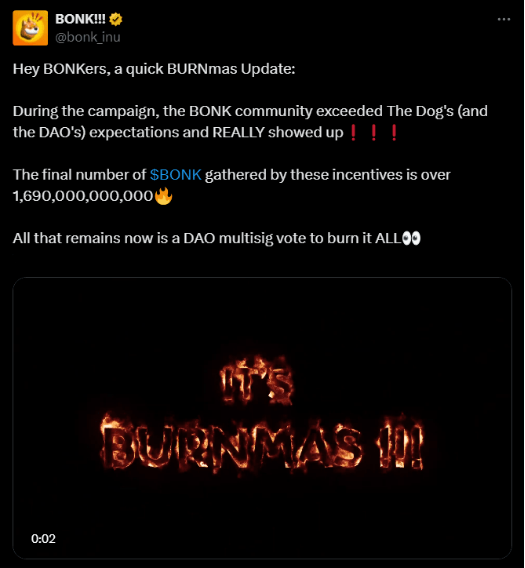 以BONK为例,他们去年底启动了一个名为“BURNmas”的销毁计划。根据 CoinGecko 的数据,由社区投票累计销毁了超过1.69 万亿 BONK(约合3.8 亿人民币)。春节期间,社区再次自发性销毁 2.025 万亿BONK代币(约合2.6 亿人民币)。这种操作看似简单直接,但链上数据的透明性让每一次销毁都成了市场共识的锚点,即流通量减少意味着抛压降低,而稀缺性提升,则为价格筑起一道缓冲墙。